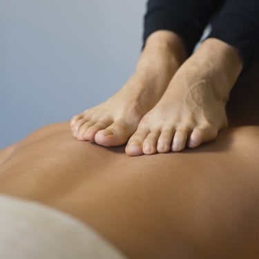 A deep-tissue massage technique where the therapist uses their feet to apply pressure for deeper muscle relief.